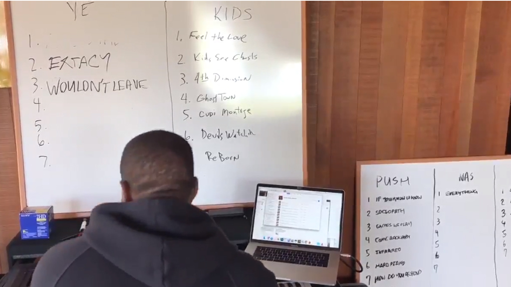 While enjoying the stripped-down, bass-heavy beat Kanye is rocking to in the foreground, you’ll notice, from left to right, the work-in-progress tracklists for three of the five aforementioned albums. Kanye’s column is currently sporting two of seven tracks (“Extacy” and “Wouldn’t Leave”), Nas’ column has one (“Everything”), and Teyana Taylor has three.